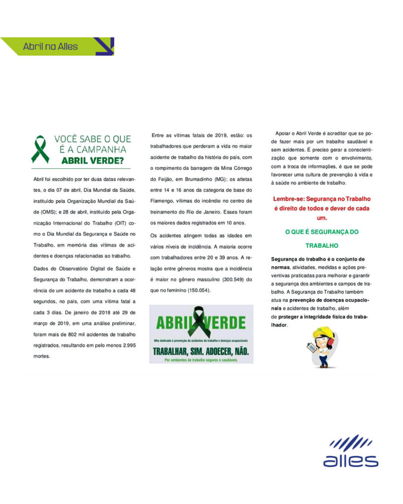 A campanha Abril Verde tem como objetivo chamar atenção para a importância da prevenção de acidentes e doenças ocupacionais. Na Alles, abraçamos essa causa com a seriedade que ela merece, integrando toda a equipe em palestras, ações educativas e momentos de troca que reforçam nossa cultura de segurança e prevenção.